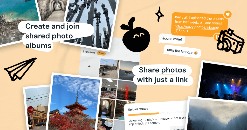 Create an album, share the link, and share it to allow others to view the photos (without an account!) and add their photos too. Cozy is free to use and uploads your photos in high quality plus we do not train AI on your photos.
